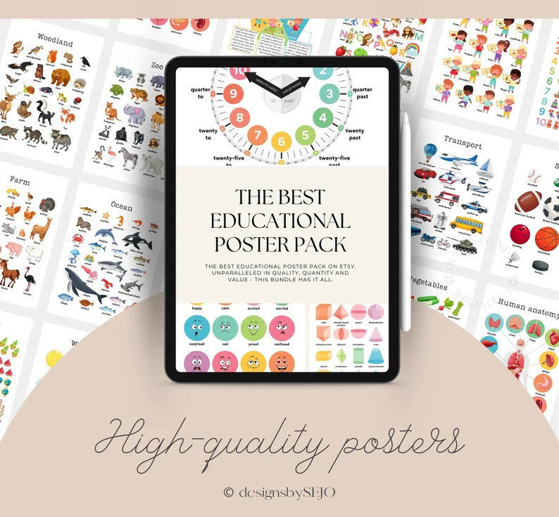 This is a digital download product featuring a set of 101 educational posters. The posters are designed to be colorful and engaging, aimed at aiding children’s learning in various subjects such as the alphabet, numbers, shapes, animals, and more. The posters are intended for use in classrooms, playrooms, and home learning environments.